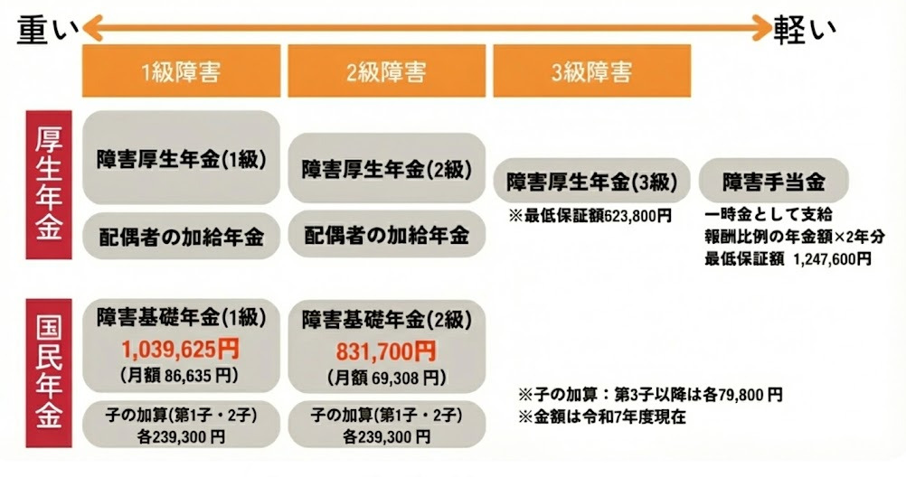 具体的には、障害の程度で受給額が異なり、また、その他の条件や障害の種類によっても差が出ることがあります。